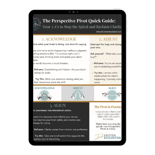 I’m Dr. Kristen Eccleston, and I help brilliant, burned-out minds turn overthinking into action, emotional spirals into clarity, and self-doubt into unstoppable momentum—using my science-backed, soul-aligned method: The Perspective Pivot™